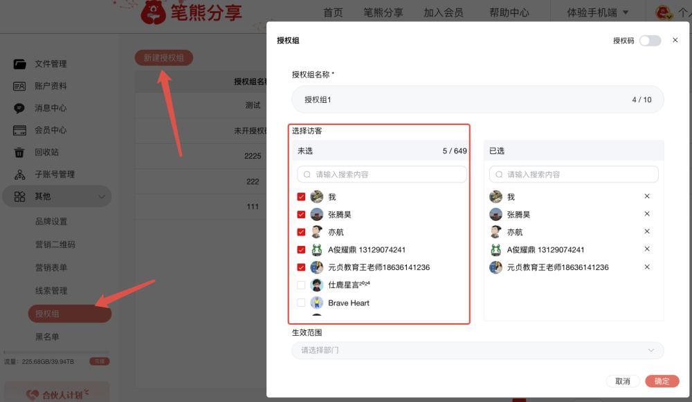 有了访客信息,就可以在申请授权下的授权管理中 ,新建授权组 ,把群内人员拉入授权组。
