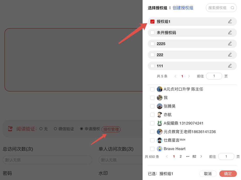 上传文件后阅读验证方式选择申请授权,授权管理里面选择之前创建的授权组,点击确认这样就完成了文件和授权组的绑定,该文件只有授权组内的用户可以访问。